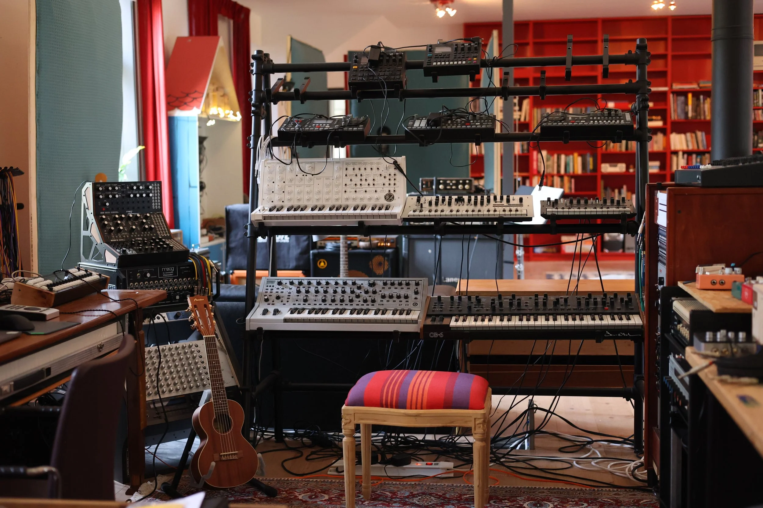 If you’re looking for a creative getaway with your band or team, we have the possibility to host you in Hälleforsnäs for as long as you need. The house has a big main working room (a former cinema room of 100+square meters and 10 meters roof height) with movable acoustic panels and possibility to record anything from a needle drop to a multitracked band. There’s also several other rooms where people can go off and work by themselves if needed.